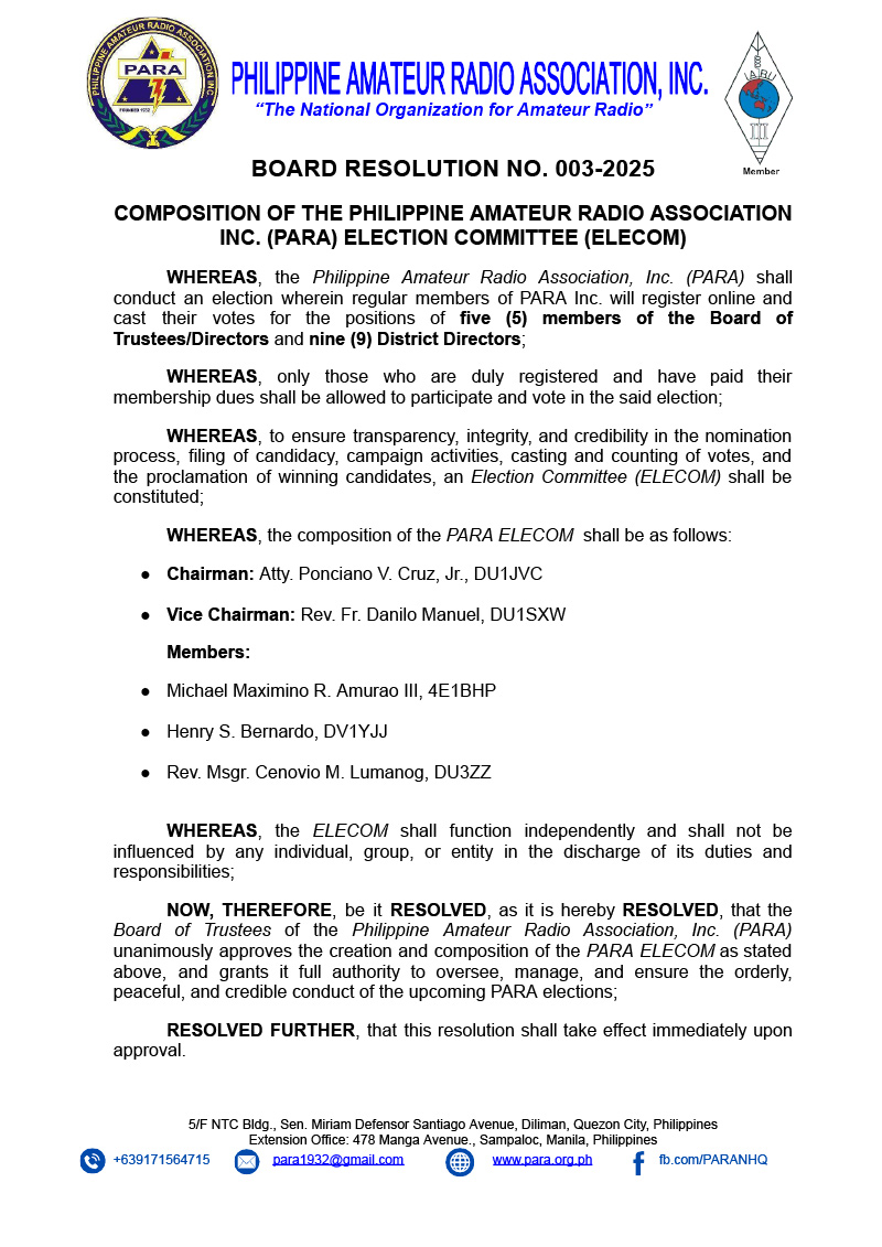 Composition of the Philippine Amateur Radio Association Inc. (PARA) Election Committee (ELECOM)